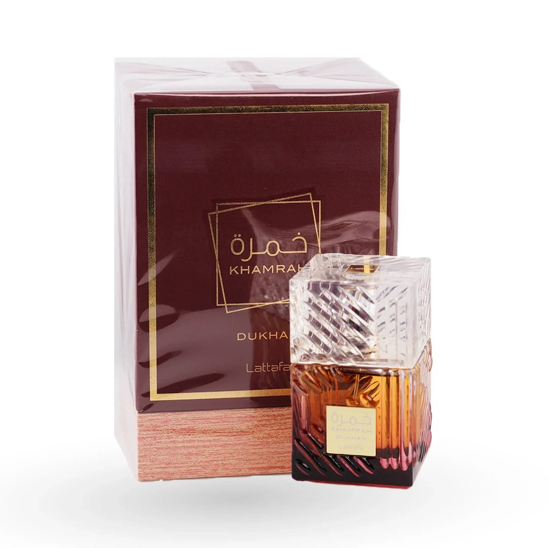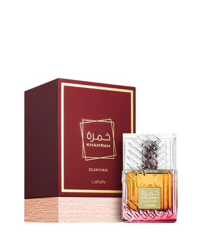 Khamrah Dukhan de Lattafa Perfumes es una fragancia de la familia olfativa Oriental para Hombres. Esta fragrancia es nueva. Khamrah Dukhan se lanzó en 2025. Las Notas de Salida son especias, pimiento morrón y mandarina; las Notas de Corazón son incienso, ládano, flor de azahar del naranjo y pachulí; las Notas de Fondo son tabaco, praliné, ámbar, haba tonka y benjuí.